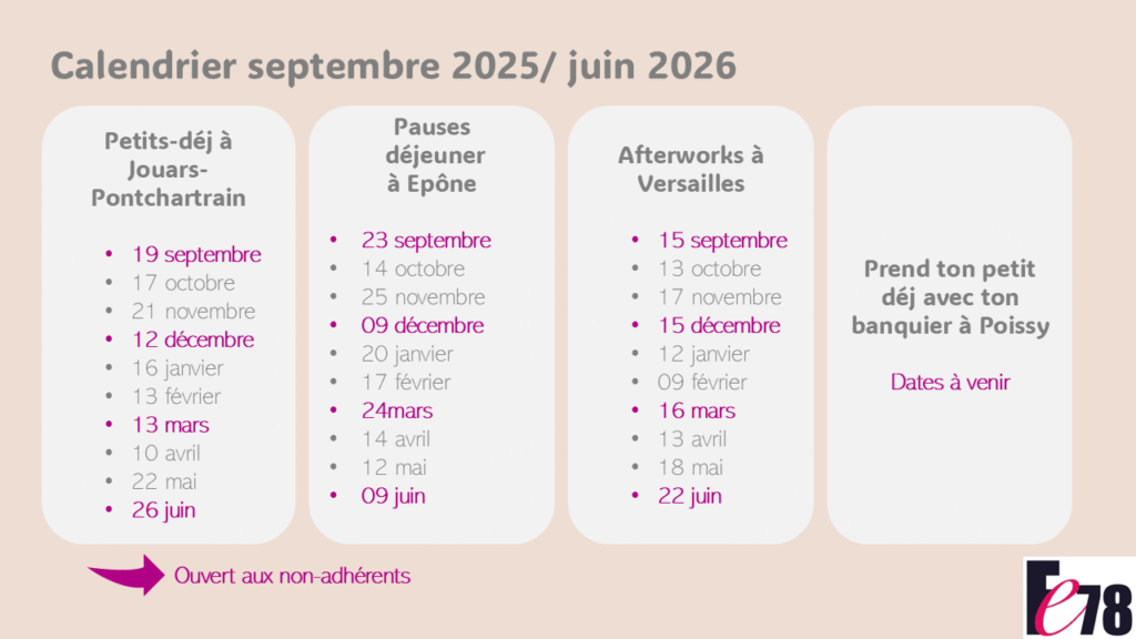 Les femmes entrepreneurs 78 proposent également des événements exclusifs réservés aux membres. Pour y accéder, cliquez ci-dessous.